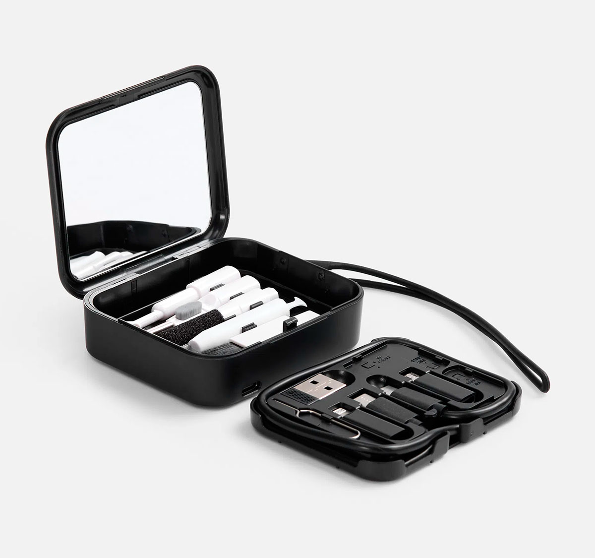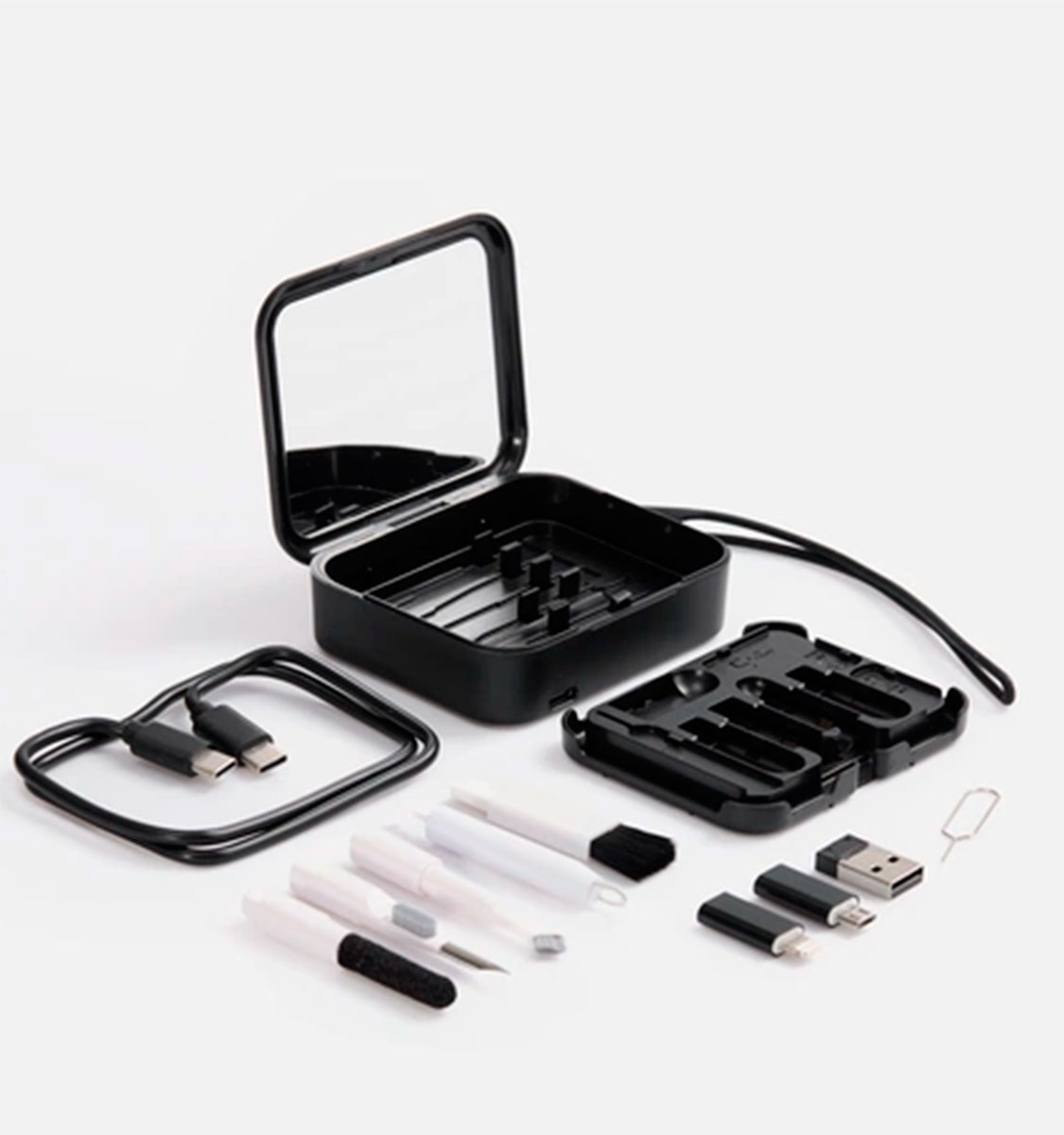 - аксессуары для чистки гаджетов: щетка с наклонной щетиной, перо для чистки со щеткой для наушников, насадка для чистки футляра от наушников, двусторонняя насадка для чистки разъемов зарядки, щетка с мягкой щетиной