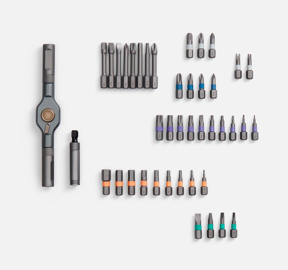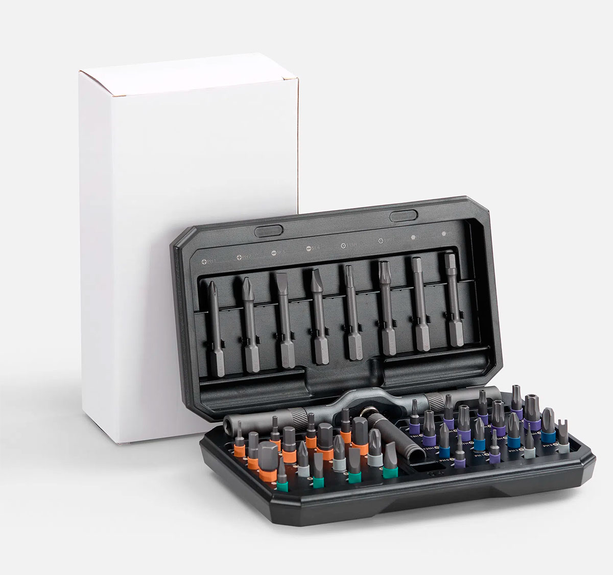 В комплекте реверсивная отвертка с трещоткой, состоящая из реверсивной основы, трех съемных магнитных держателей и 40 бит: