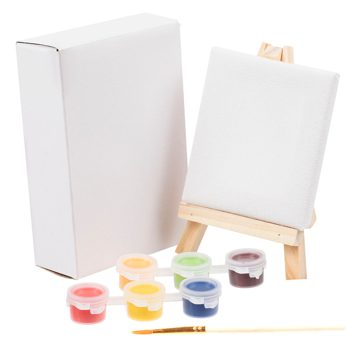 • Мини мольберт с холстом, кисть и краски. Мольберт: 7х12,5х2 см; холст: 7х8 см; упаковка 3,7х8,5х12,5 см