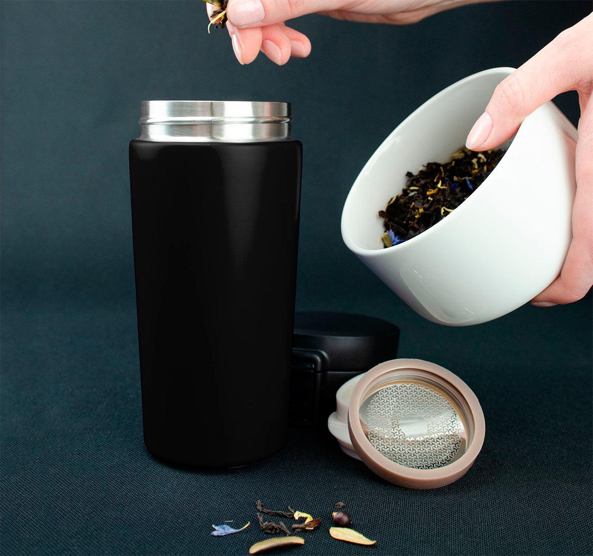 Термостакан - термос с ситечком. Емкость 350 мл. Двухслойная вакуумная конструкция из нержавеющей стали внутри и снаружи. Герметичная откидная крышка-клапан с ситечком. Крышку можно мыть в посудомоечной машине, корпус рекомендуем мыть вручную.