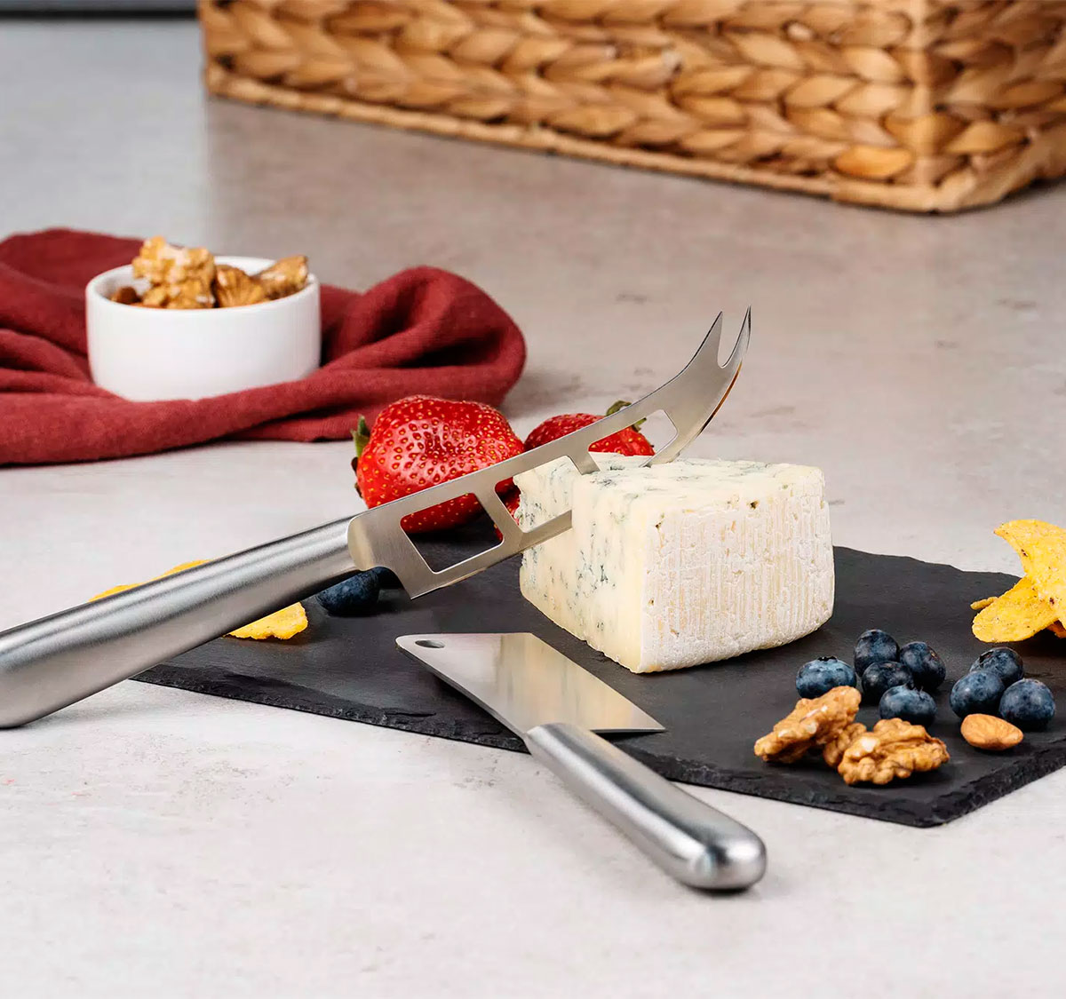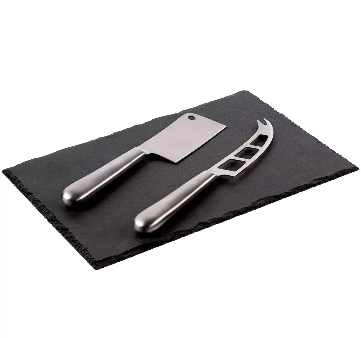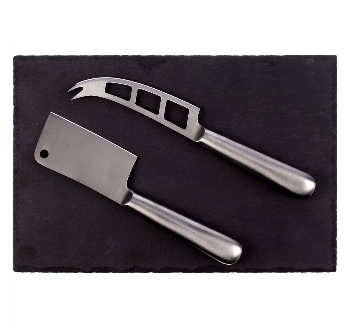 В комплекте сланцевая доска, нож-топорик для твердых сортов сыра, нож для сыров средней мягкости. Поставляется в индивидуальной подарочной коробке с ложементом.
